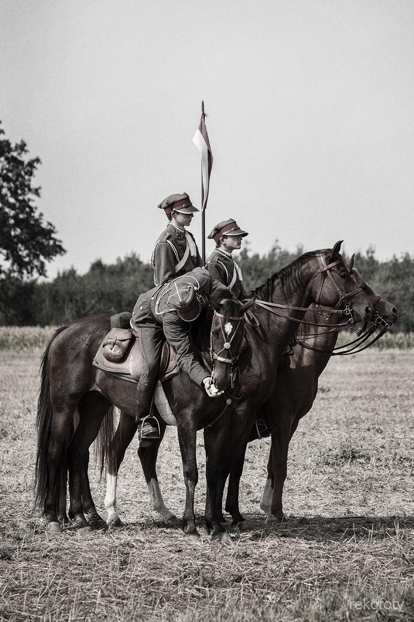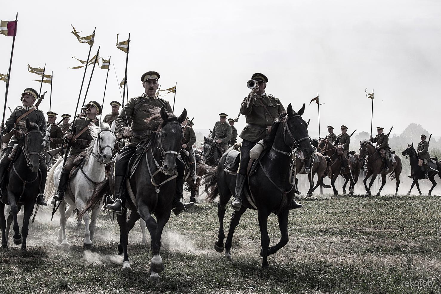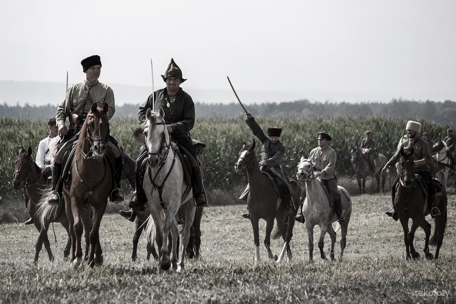 Po około godzinie na polach rozpoczęła się inscenizacja. Każdy z nas zajął upatrzoną przez siebie pozycję, wybierając najlepsze miejsce w swoim mniemaniu. Ha, ha. Taka już jest niepokorna natura fotografa, co jest piękne – dzięki temu z tej samej imprezy powstają różne ujęcia i odmienne spojrzenia na temat. Inscenizacja zrobiła na mnie ogromne wrażenie. Ostatni raz byłam tak podekscytowana podczas szarży husarii pod zamkiem w Gniewie. Ułani i ich konie prezentowali się wspaniale, tworząc niemal jeden zsynchronizowany organizm. Idealna synchronizacja i harmonijne zespolenie człowieka ze zwierzęciem. Mam nadzieję, że udało mi się choć w części uchwycić to zjawisko na moich zdjęciach. Również ekipa odtwarzająca rosyjską armię konną Siemiona Budionnego wykonała znakomitą pracę.